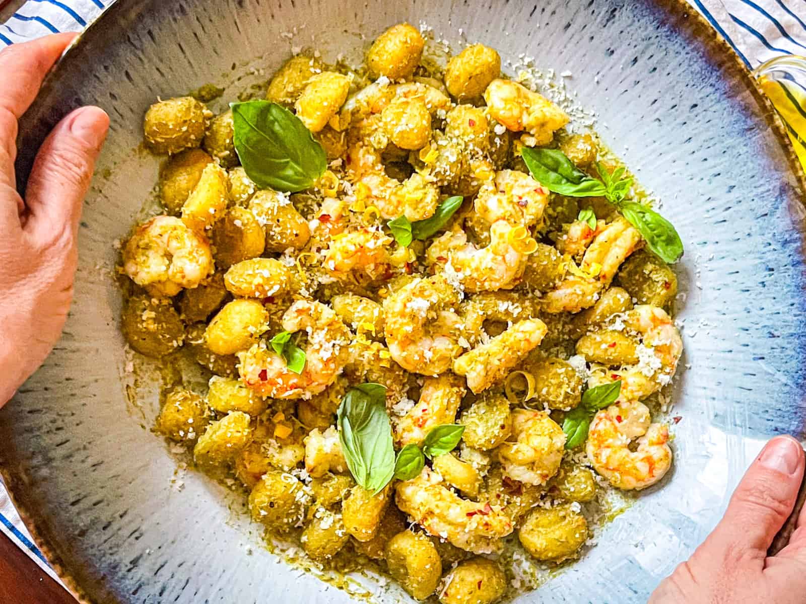 - When the air fryer finishes, transfer the gnocchi and shrimp directly into the bowl with the pesto. (I recommend scooping out the contents of the air fryer basket, not tipping it over, as the shrimp will have released water during cooking that will spill into your pasta.) Toss gently until everything is coated.