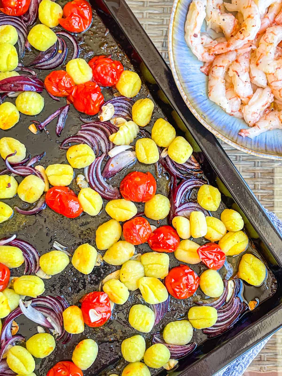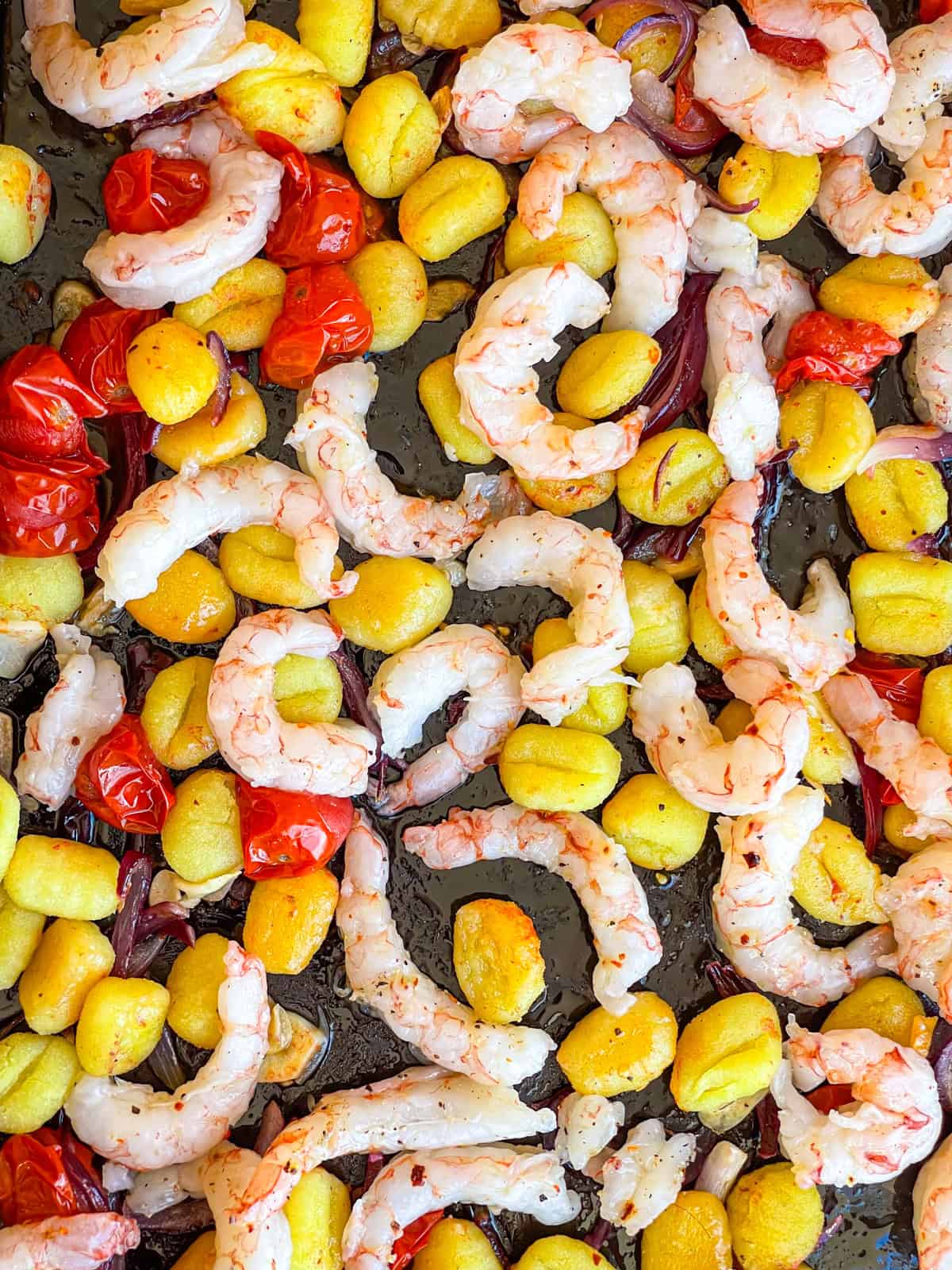 - Add remaining 3 tablespoons of olive oil to the sheet pan. Halve and thinly slice red onion. Slice garlic cloves. Add them, along with whole cherry tomatoes and gnocchi to the pan. Season with ½ teaspoon salt, ¼ teaspoon black pepper and red pepper flakes, if using.