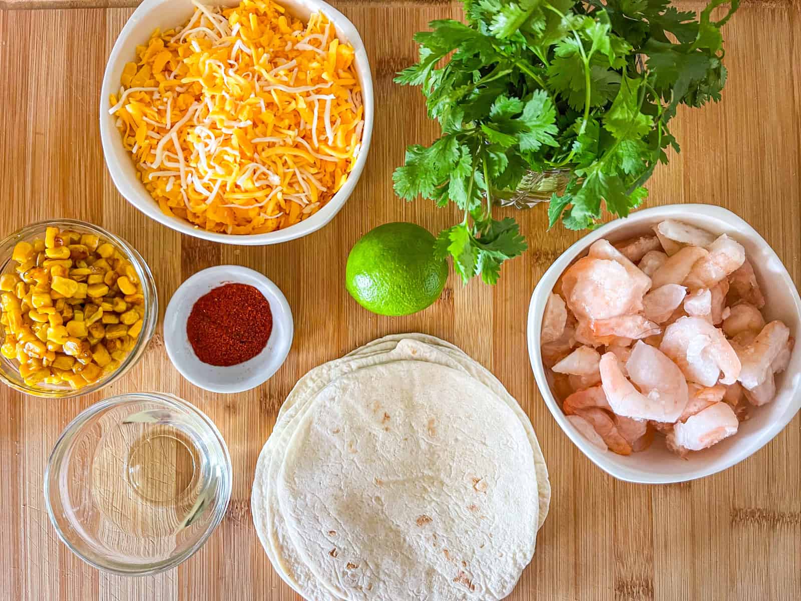 - Divide cheese among tortillas (about ¼-1/3 cup each), leaving a 1-inch border. Top with diced shrimp, corn, and sprinkle with remaining chipotle powder.