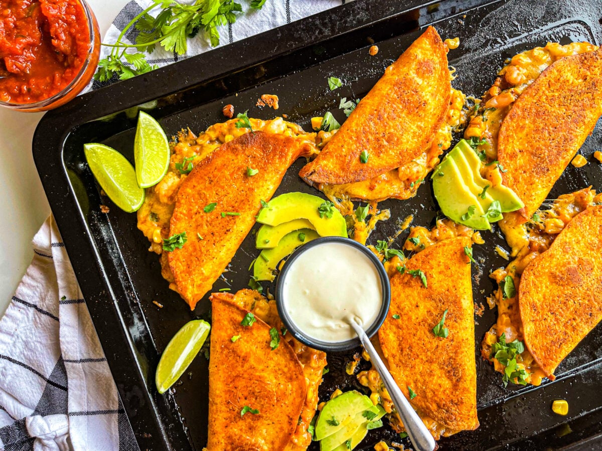 These crispy, cheesy, sheet-pan quesadillas let you make 6-8 quesadillas at once, no standing at the stove flipping one at a time. This method uses a preheated second pan on top to crisp both sides simultaneously, like a giant panini press.