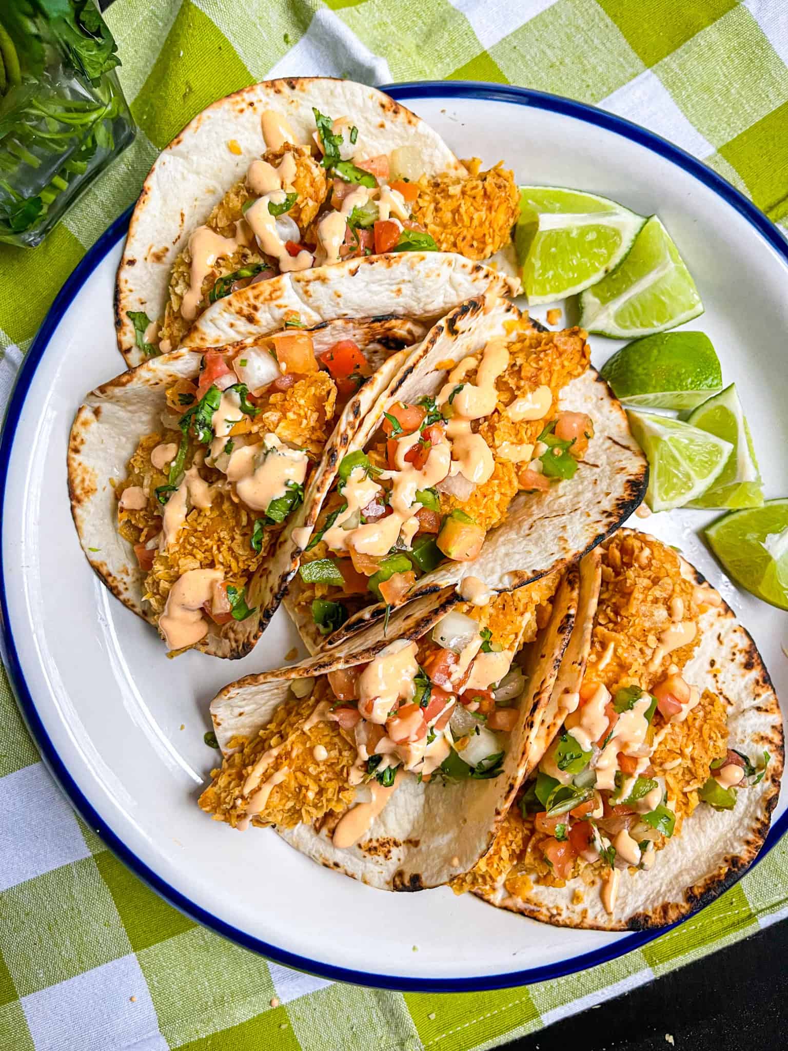 Crispy, spicy, ready in under 20 minutes, and the best use for the bottom of a bag of tortilla chips. These tortilla crusted fish tacos use a spicy lime aioli to glue crushed chips to fish strips, then the air fryer does what it does best. The result is crunchy on the outside, tender and flaky on the inside...fish fingers built for tacos.